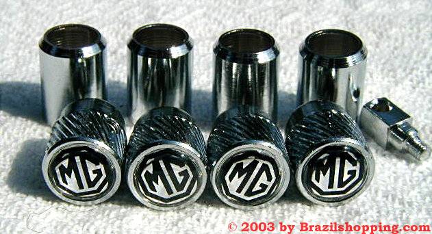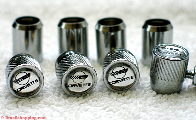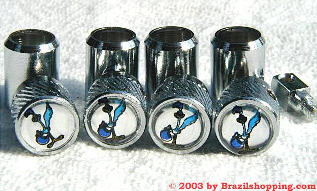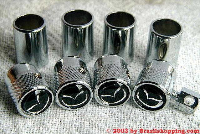 types of tyre valve caps: Plastic ones with chrome finish and metal chrome ones with anti-theft devices.